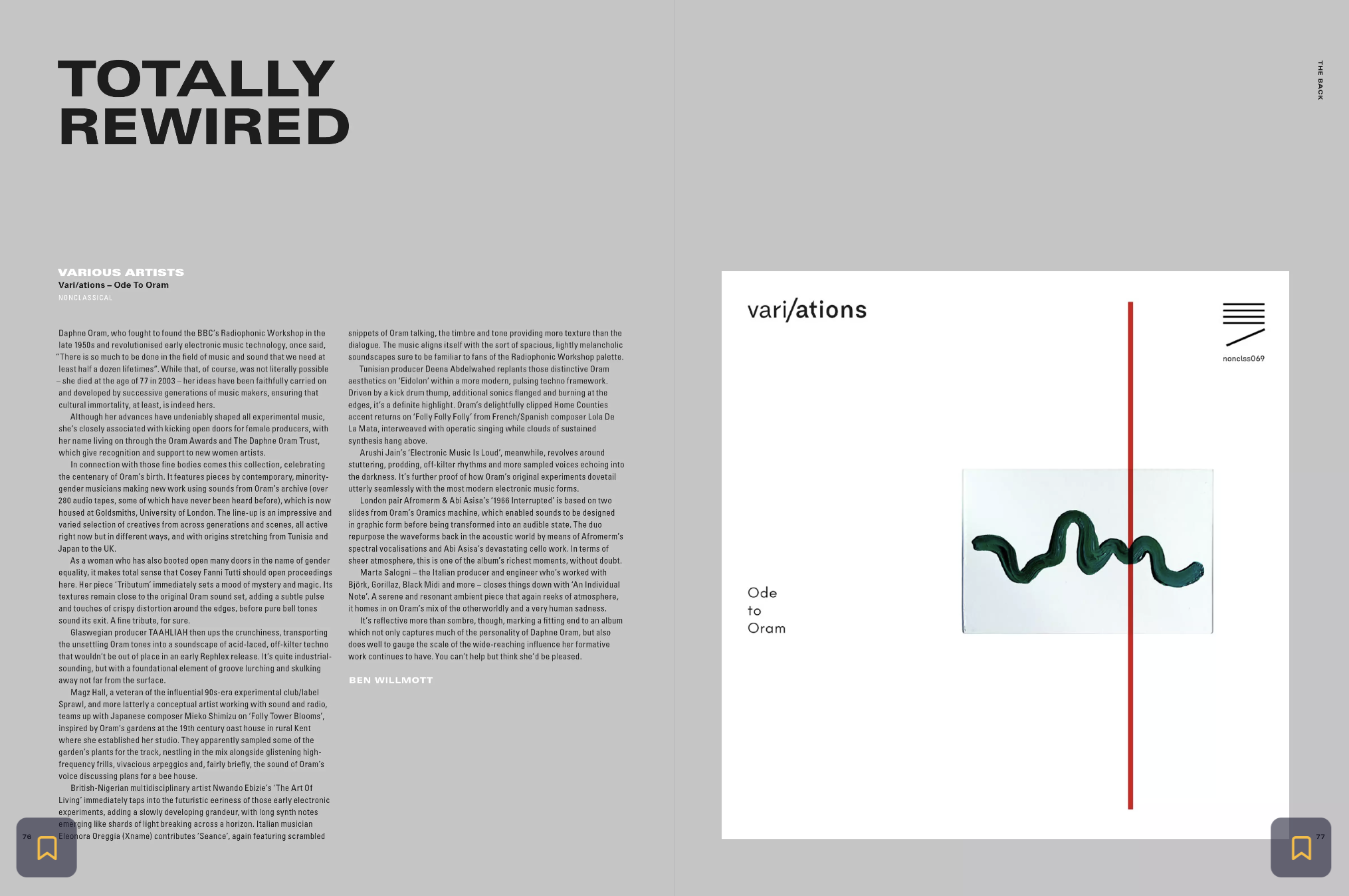 A new project draws on the sound archive of BBC Radiophonic Workshop co-founder and electronic music pioneer Daphne Oram - Abi Bliss. The Wire, Issue 502. December 2025.